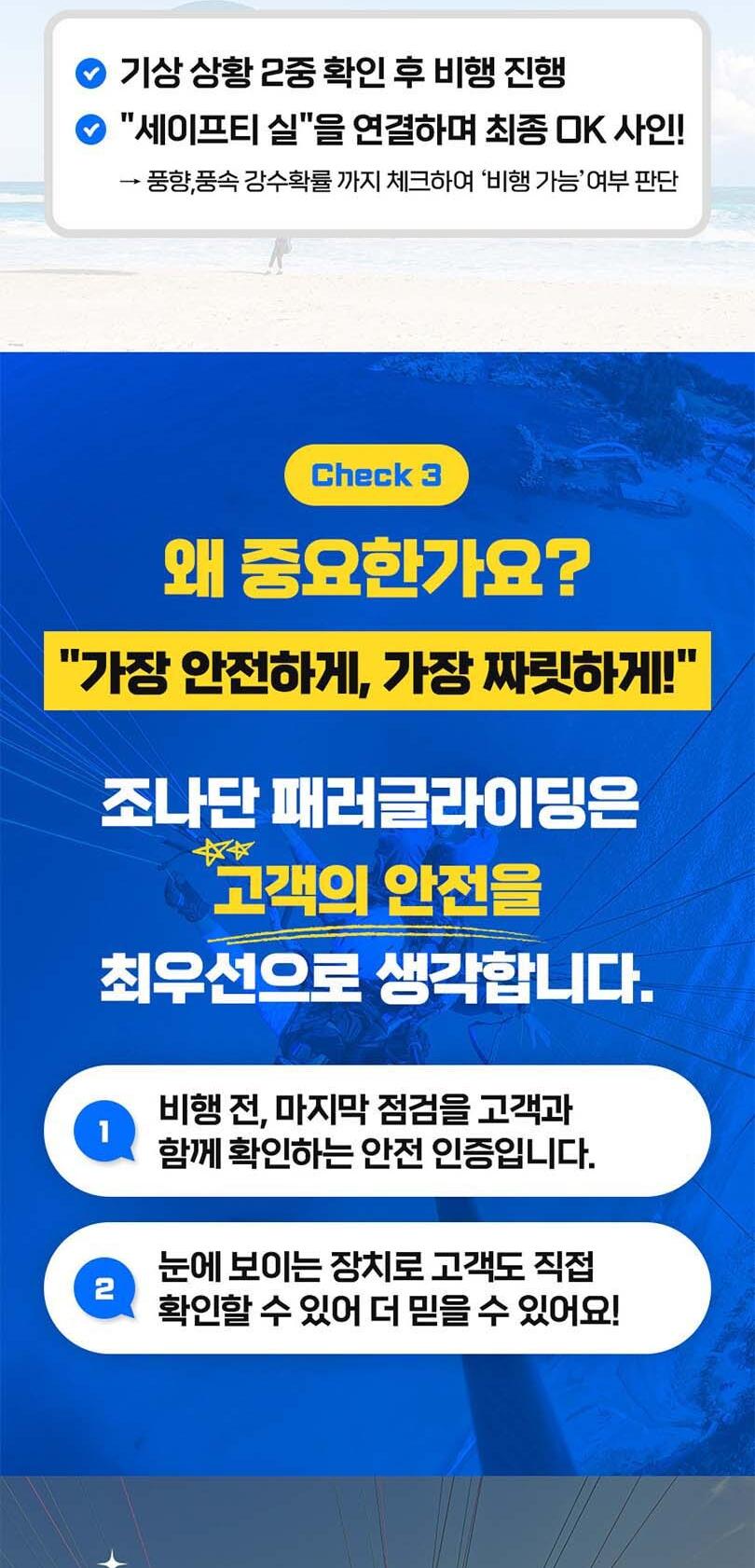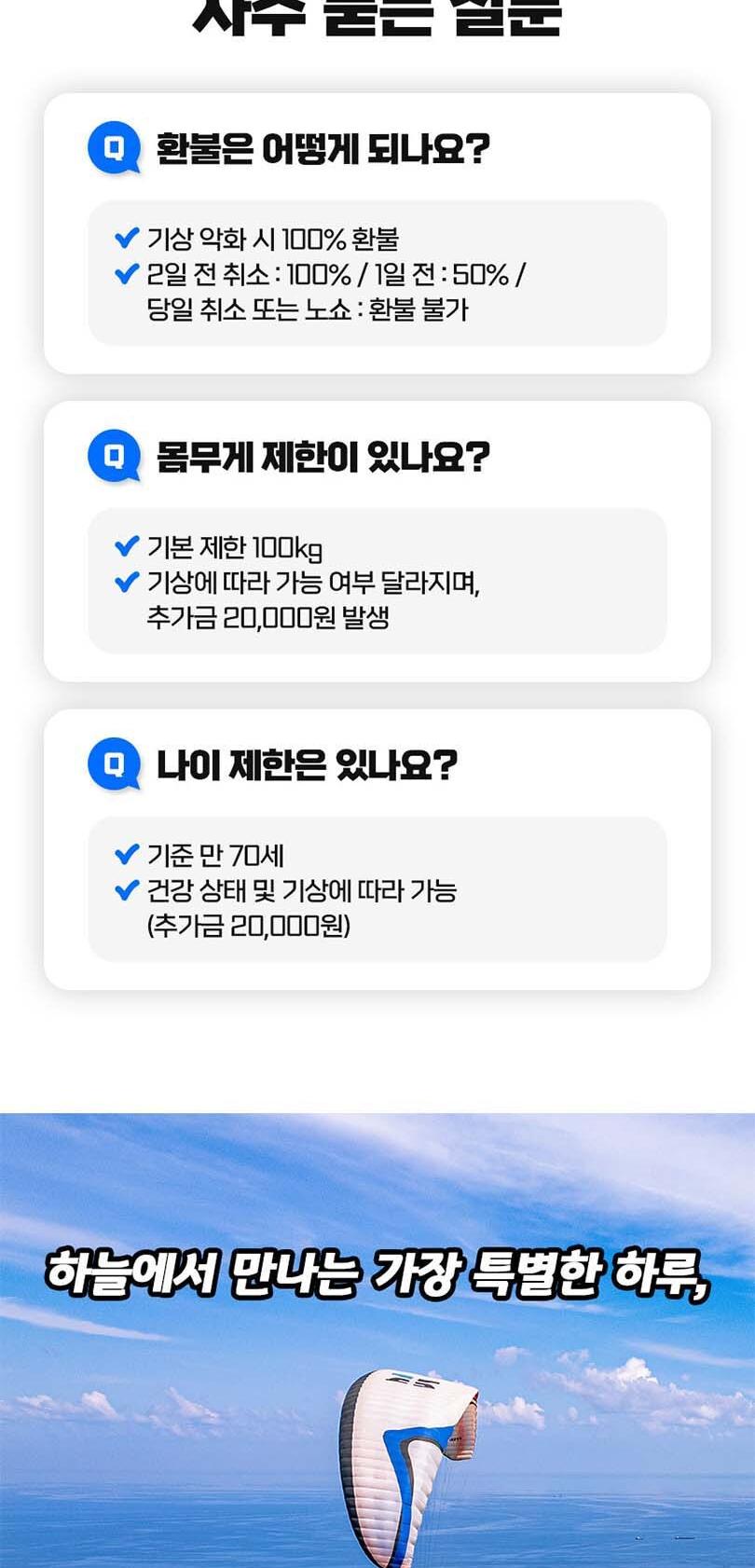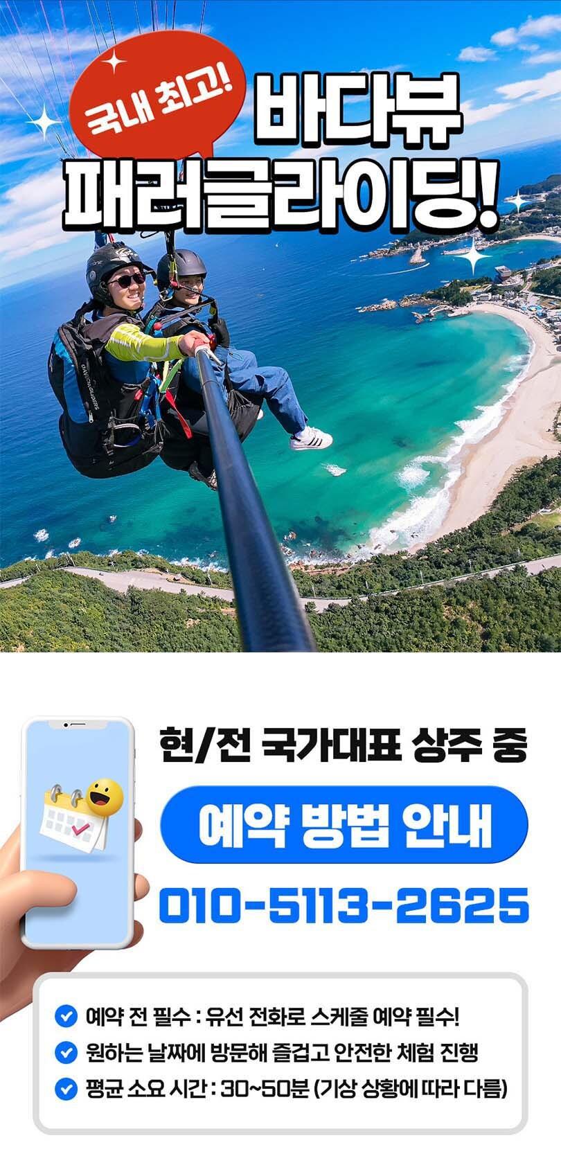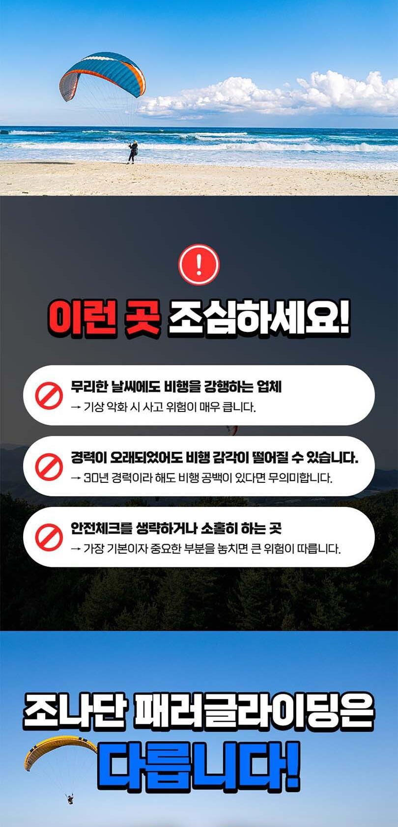* 1. 티켓 구매전 업체로 전화 후 희망날짜 및 시간 예약하기. * 2. 편한복장 및 운동화. * 3. 총 소요시간 평균 30분~50분 기상에따라 차이는 있을수 있습니다. * 4. 건강상태에 따라 체험이 제한될수 있으니, 지병이 있으시다면사전에 알려주세요. * 5. 이륙장에서 비행을 포기하는 경우 환불불가 * 6. 기상악화로 인해 취소시 환불100%