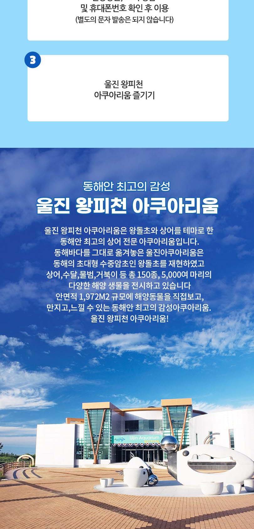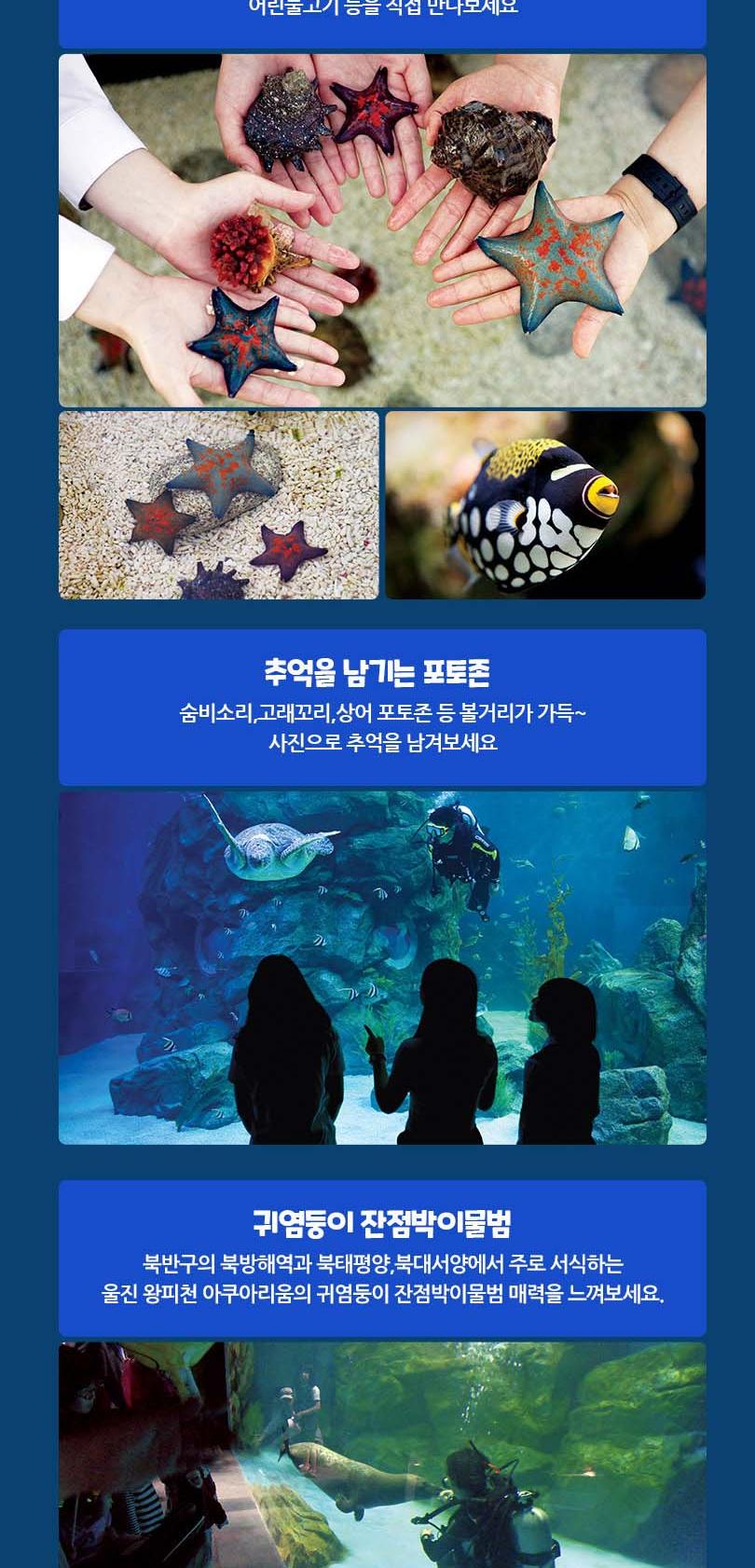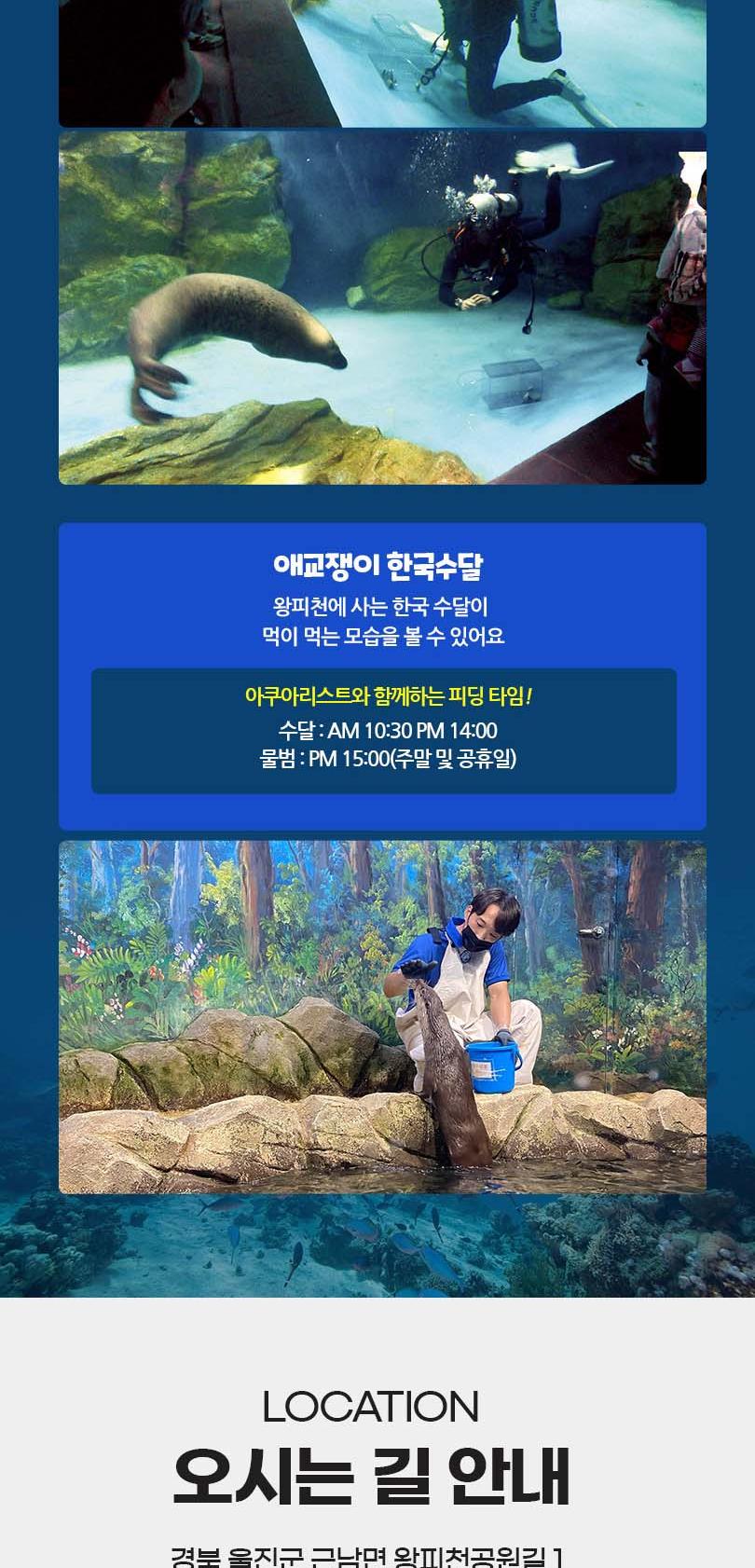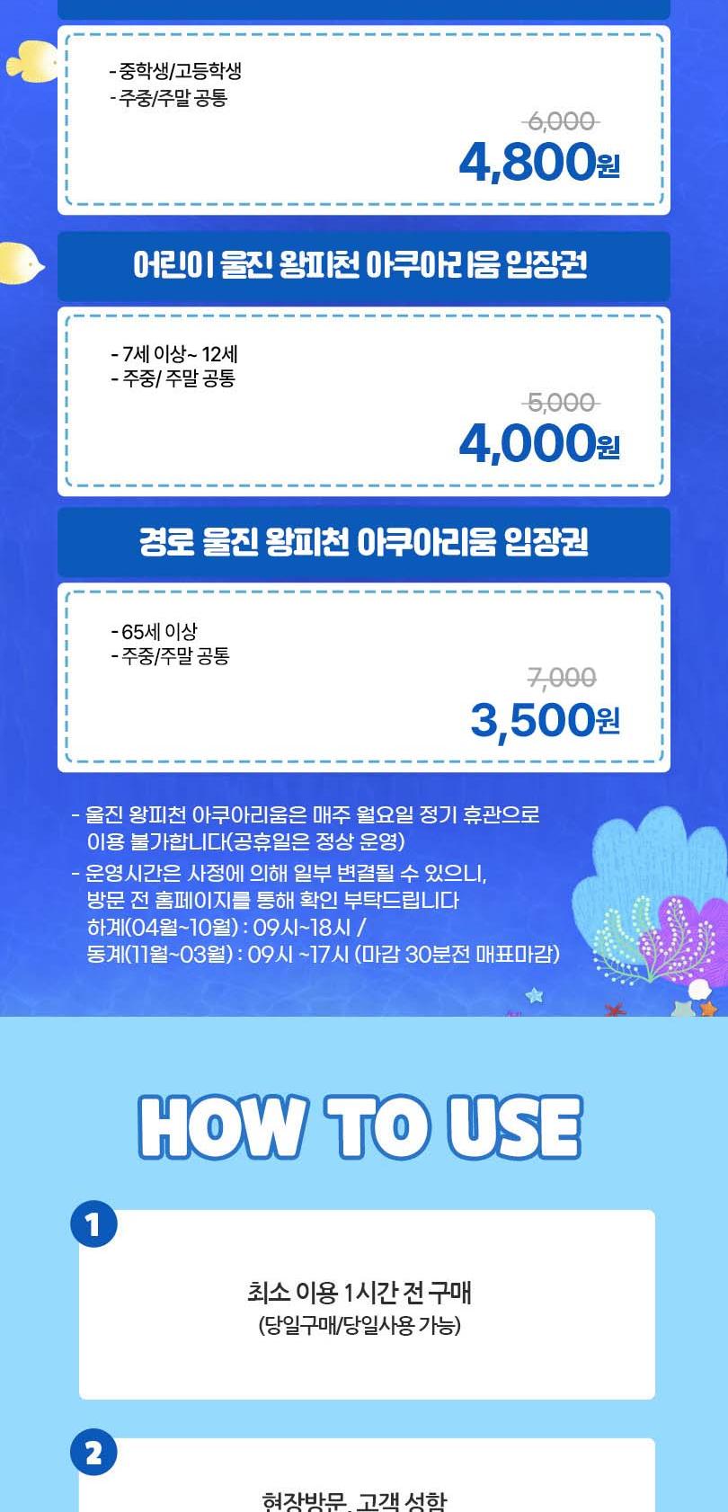 * 수달,물범 피팅타임 : 수달 AM 10:30, PM:14:00 / 물범 PM 15:00 (주말 및 공휴일) * 단체별 관람인원이 20명 이상 시 단체관람 할인혜택을 받으실 수 있습니다. * 단체관람 대상 : - 유아 - 초등학교 단체 - 중학교,고등학교 단체 - 일반,기업,외국인 단체 *단체예약문의는 054-789-5530 으로 사전 연락 바랍니다 * 문의/예약시간 : 오전 9시 ~ 오후 6시 * 사전 예약된 지정 장소에 인솔자 및 관람인원 하차 후 울진아쿠아리움 직원 안내에 따라 전체이동