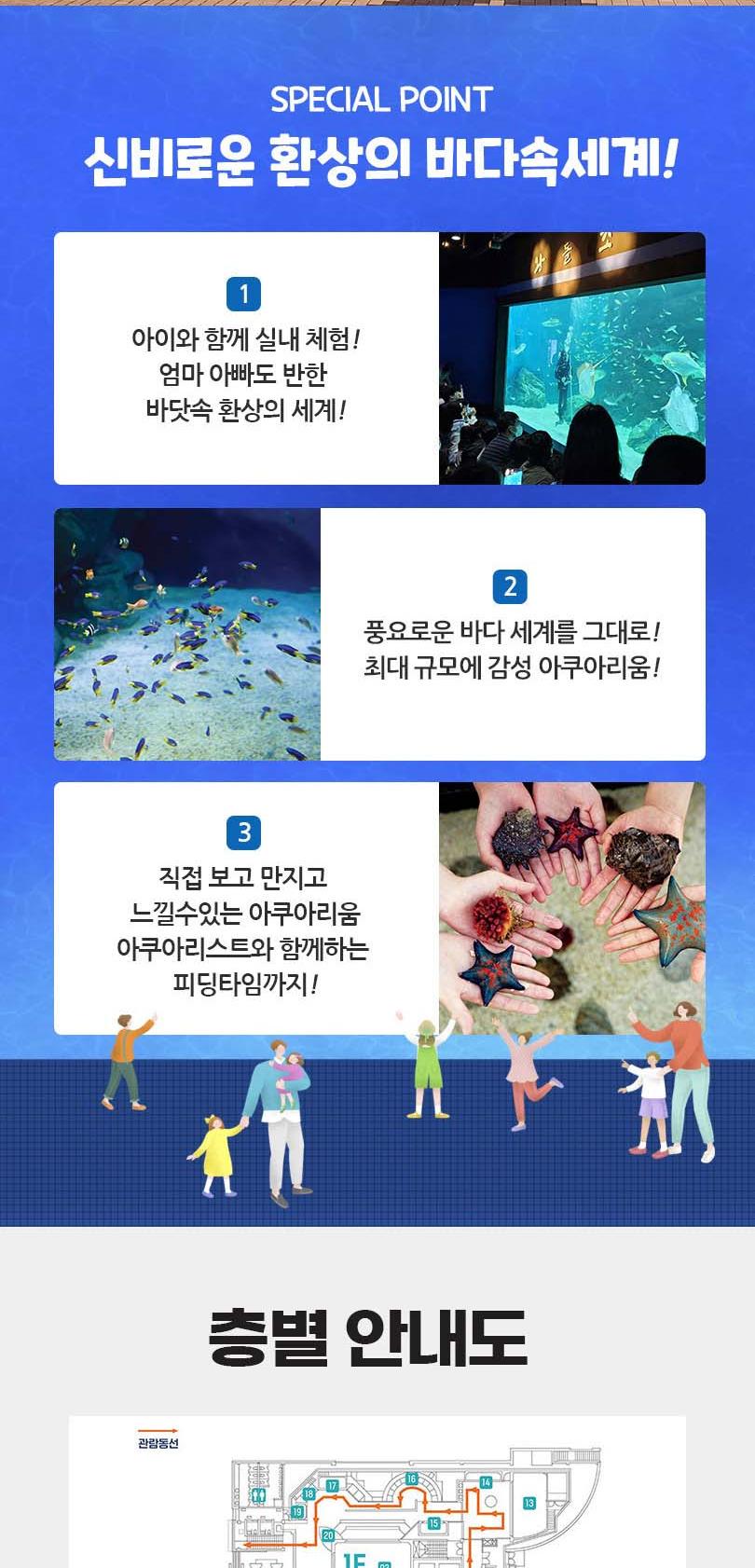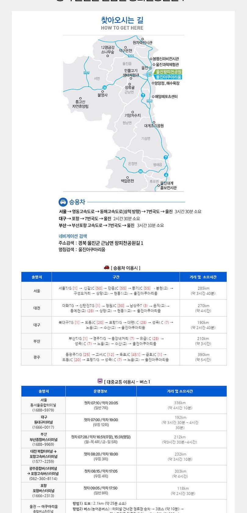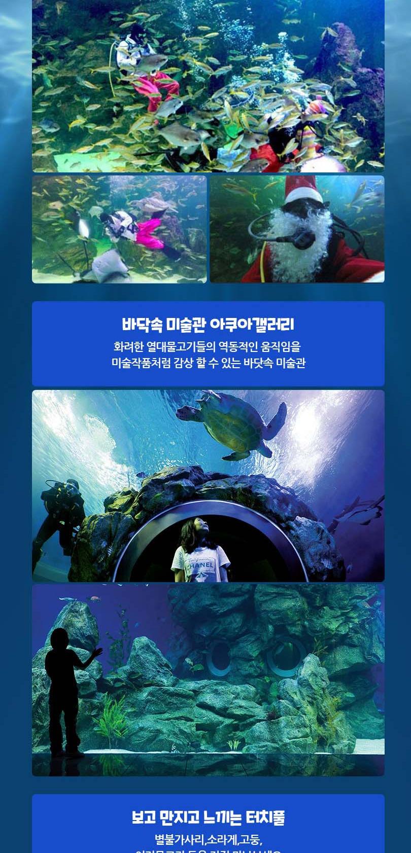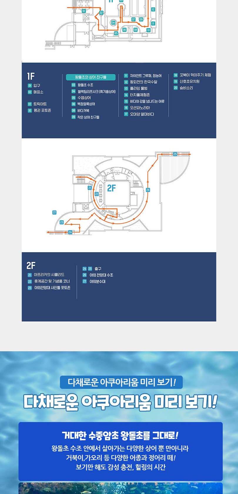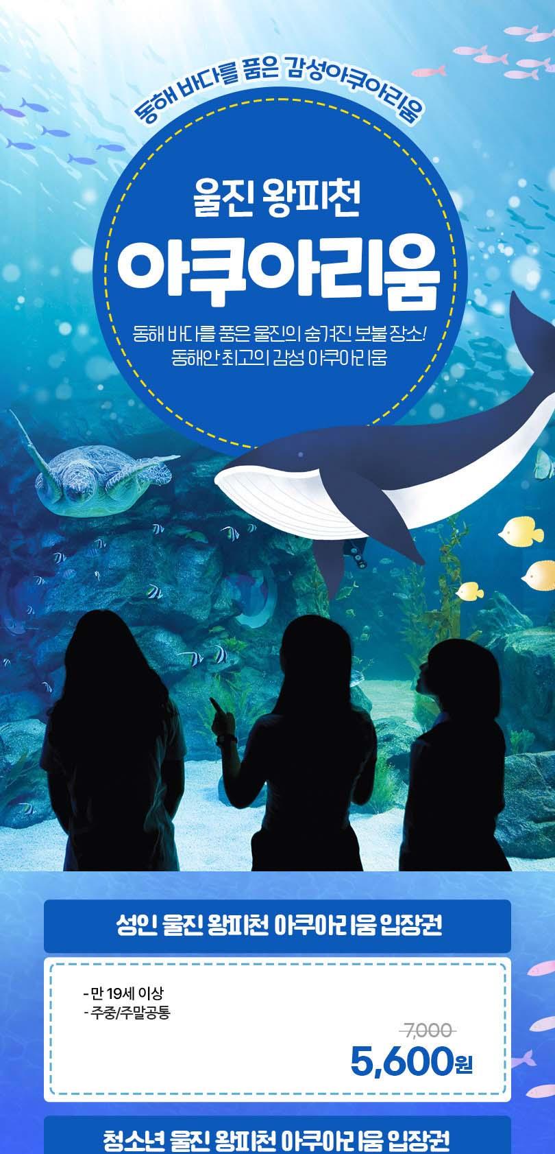 * 수달,물범 피팅타임 : 수달 AM 10:30, PM:14:00 / 물범 PM 15:00 (주말 및 공휴일) * 단체별 관람인원이 20명 이상 시 단체관람 할인혜택을 받으실 수 있습니다. * 단체관람 대상 : - 유아 - 초등학교 단체 - 중학교,고등학교 단체 - 일반,기업,외국인 단체 *단체예약문의는 054-789-5530 으로 사전 연락 바랍니다 * 문의/예약시간 : 오전 9시 ~ 오후 6시 * 사전 예약된 지정 장소에 인솔자 및 관람인원 하차 후 울진아쿠아리움 직원 안내에 따라 전체이동