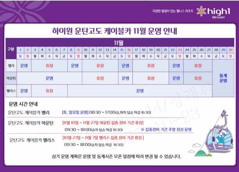 * 위치 : 마운틴 스키하우스 3층 * 운영시간 : 운영시간 09:30 ~ 18:00 (승차 탑승마감 16:30) * 대인 : 중등생 이상 * 소인 : 24개월 ~ 초등학생 이하 / 유아(24개월 미만) 무료 * 코스안내 - 하이원 운탄고도 케이블카 마운틴 : 마운틴 스키하우스 ↔ 하이원탑 (왕복 40분 소요) * ※ 기상 및 영업상황에 따라 운영일정(영업시간)이 변경 될 수 있습니다.