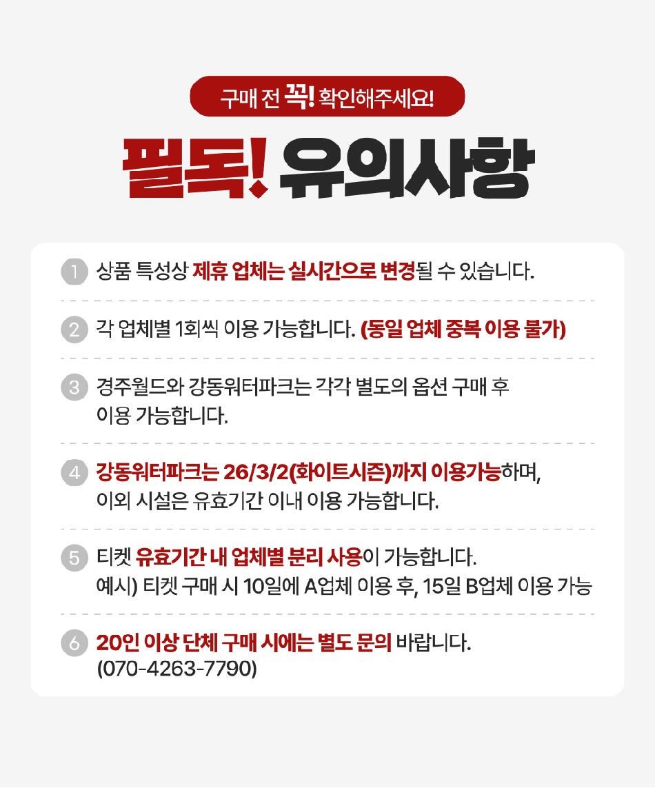 * 상품 특성상 제휴 업체는 실시간으로 변경될 수 있습니다. * 동일 업체 중복 이용 불가합니다. * 티켓 유효기간 내 업체별 분리 사용 가능합니다. * 티켓 부분 환불/부분 사용은 불가하며 일부 티켓 환불 필요 시 반드시 사용 전 티켓 전체 환불 후 재구매 바랍니다. * 단체 구매 시 별도 문의 바랍니다.