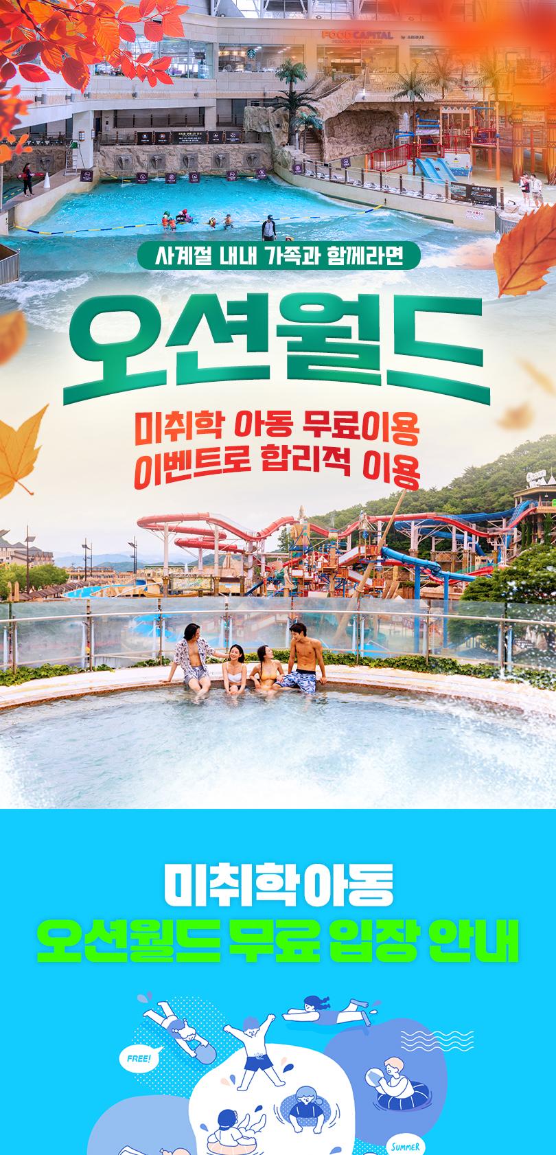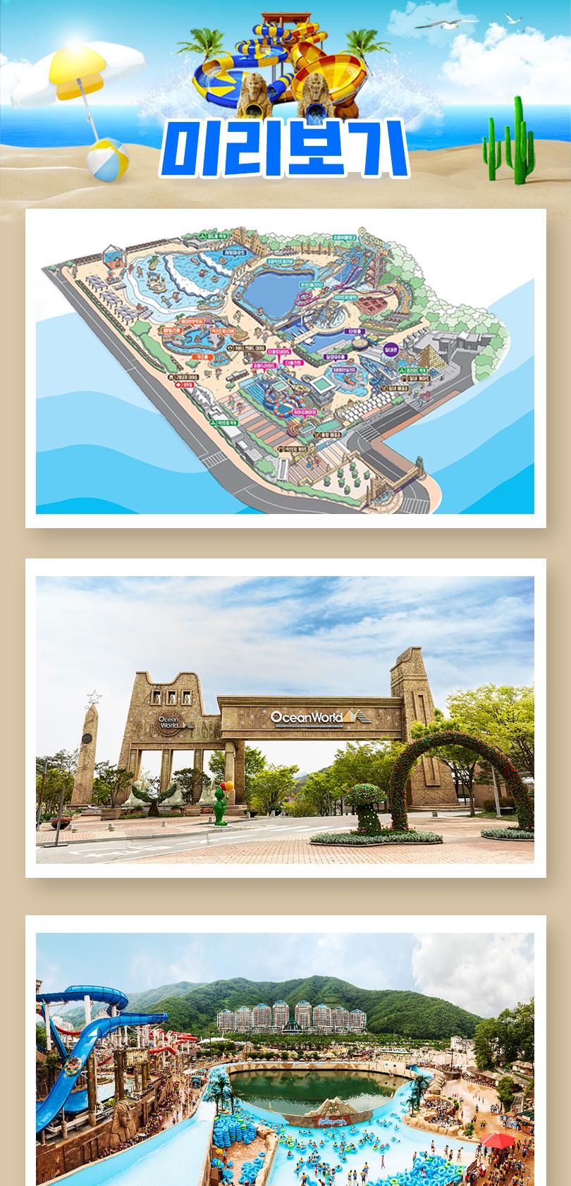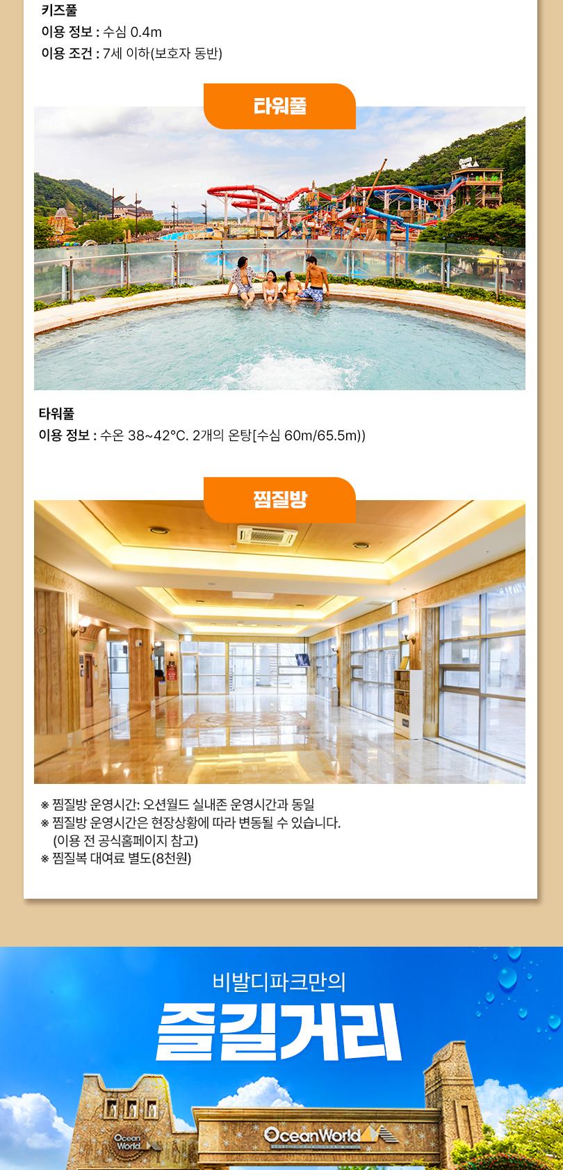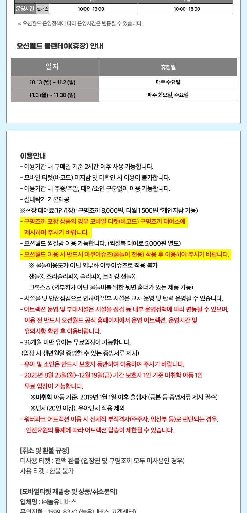 오션월드 유의사항 * 이용기간 내 구매 기준 2시간 이후부터 사용가능 * 모바일 입장권(바코드)을 1인 1매 사전에 캡처 후 게이트 입장 시 제시바랍니다. (단, 다크모드를 해제 후 캡처) * 시즌별 유효기간 내 대인/소인 구분없이 이용 가능합니다. * 아쿠아슈즈 착용 의무안내 - 물놀이용도가 아닌 외부화는 아쿠아슈즈로 적용 불가 - 샌들X, 조리슬리퍼X, 슬리퍼X, 트래킹 샌들X - 크록스△ (외부화가 아닌 물놀이를 위한 뒷면 홀더가 있는 제품 가능) * 본권은 야외락커가 제공되는 상품입니다. - 야외락커 이용 기준 (현장 1인 5천원 추가 결제 후 실내락커 변경 이용가능) - 단, 야외락커 미운영 시 실내락커 추가 결제료 없음 * 오션월드 이용 중 찜질방 이용이 가능합니다. (찜질방 대여료 별도 8천원) - 구명조끼 미포함 상품이며, 타월은 현장 유료대여 가능합니다. (개인지참 가능) * 현장대여료 : 구명조끼 8천원, 타월 1.5천원(1매) * 시설물 및 안전전검으로 인하여 일부 시설은 교차 운영될 수 있습니다. * 어트랙션 운영 및 부대시설은 시설물 점검 등 내부 운영정책에 따라 변동될 수 있으며, - 이용 전 반드시 오션월드 공식 홈페이지에서 운영 어트랙션, 운영시간 및 유의사항 확인 후 이용바랍니다. * 종일권종으로 오션월드 오픈 시점부터 마감시간까지 이용 가능합니다. * 미취학 아동(2019년 1월 1일 이후 출생) 대상 오션월드 무료 입장 가능 - (보호자 1인기준 미취학 아동 1인 무료/생년월일 증명서류지참) * 36개월 미만 유아는 무료입장 가능합니다. - (입장 시 생년월일 증명할 수 있는 증빙서류 제시)