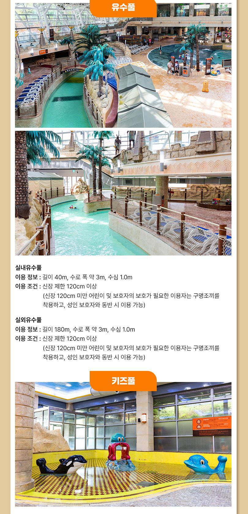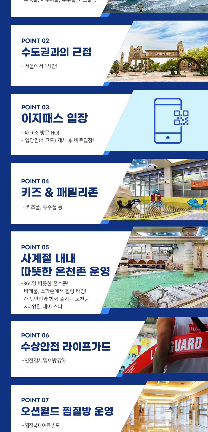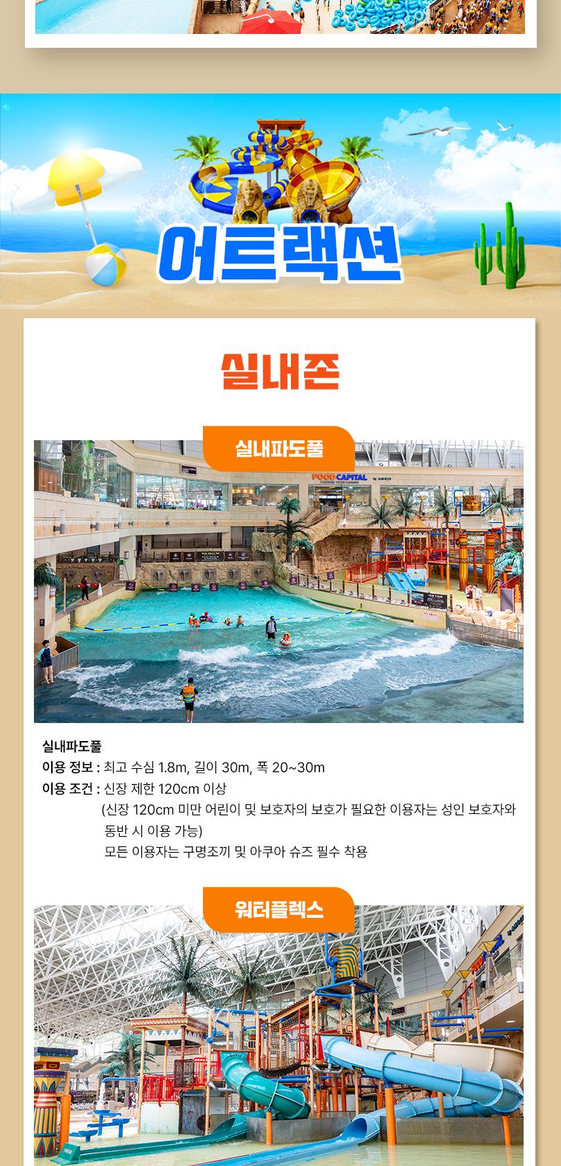 오션월드 유의사항 * 이용기간 내 구매 기준 2시간 이후부터 사용가능 * 모바일 입장권(바코드)을 1인 1매 사전에 캡처 후 게이트 입장 시 제시바랍니다. (단, 다크모드를 해제 후 캡처) * 시즌별 유효기간 내 대인/소인 구분없이 이용 가능합니다. * 아쿠아슈즈 착용 의무안내 - 물놀이용도가 아닌 외부화는 아쿠아슈즈로 적용 불가 - 샌들X, 조리슬리퍼X, 슬리퍼X, 트래킹 샌들X - 크록스△ (외부화가 아닌 물놀이를 위한 뒷면 홀더가 있는 제품 가능) * 본권은 야외락커가 제공되는 상품입니다. - 야외락커 이용 기준 (현장 1인 5천원 추가 결제 후 실내락커 변경 이용가능) - 단, 야외락커 미운영 시 실내락커 추가 결제료 없음 * 오션월드 이용 중 찜질방 이용이 가능합니다. (찜질방 대여료 별도 8천원) - 구명조끼 미포함 상품이며, 타월은 현장 유료대여 가능합니다. (개인지참 가능) * 현장대여료 : 구명조끼 8천원, 타월 1.5천원(1매) * 시설물 및 안전전검으로 인하여 일부 시설은 교차 운영될 수 있습니다. * 어트랙션 운영 및 부대시설은 시설물 점검 등 내부 운영정책에 따라 변동될 수 있으며, - 이용 전 반드시 오션월드 공식 홈페이지에서 운영 어트랙션, 운영시간 및 유의사항 확인 후 이용바랍니다. * 종일권종으로 오션월드 오픈 시점부터 마감시간까지 이용 가능합니다. * 미취학 아동(2019년 1월 1일 이후 출생) 대상 오션월드 무료 입장 가능 - (보호자 1인기준 미취학 아동 1인 무료/생년월일 증명서류지참) * 36개월 미만 유아는 무료입장 가능합니다. - (입장 시 생년월일 증명할 수 있는 증빙서류 제시)