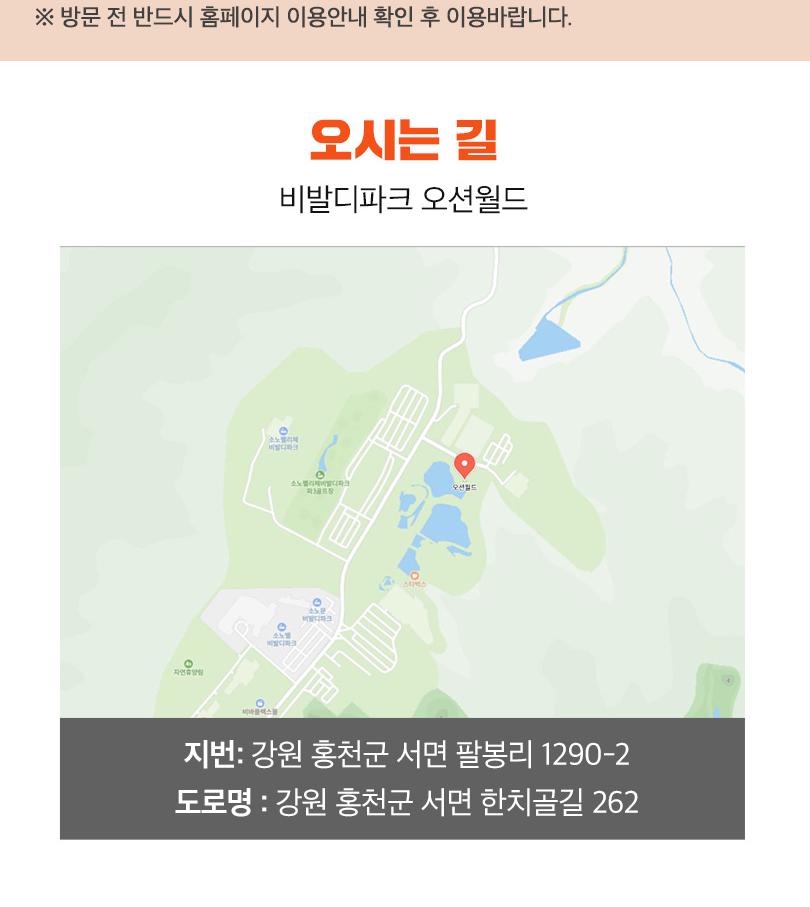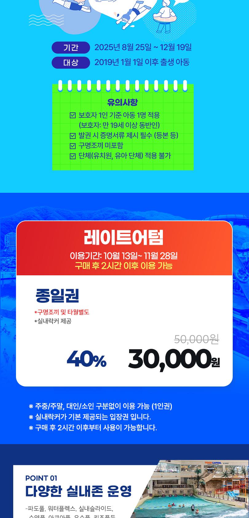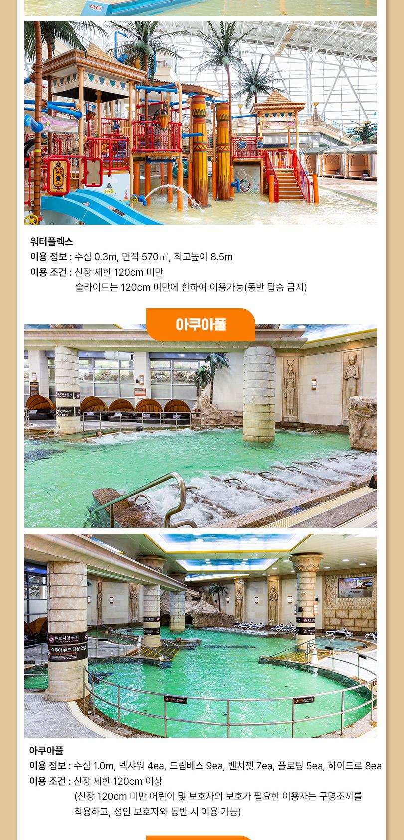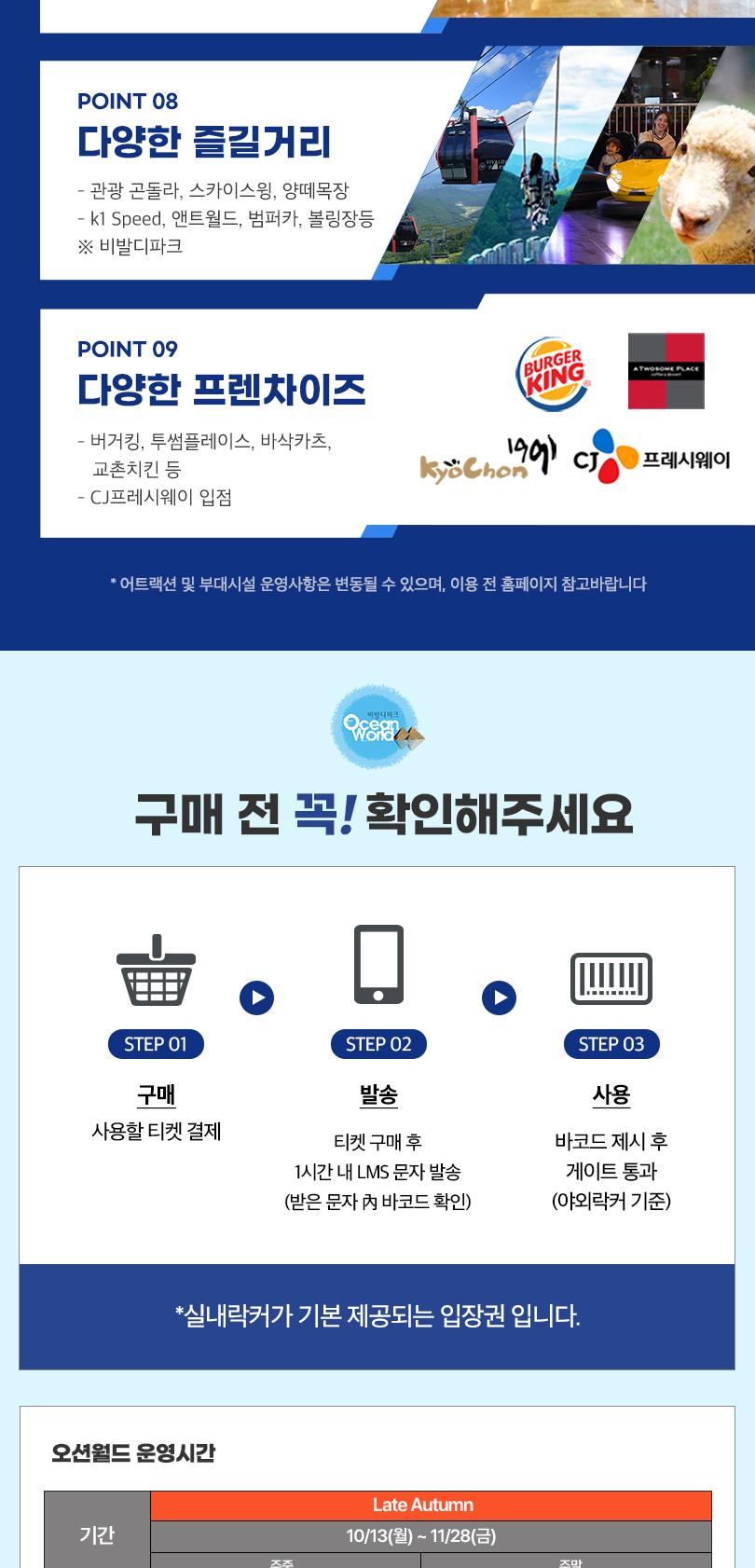 오션월드 유의사항 * 이용기간 내 구매 기준 2시간 이후부터 사용가능 * 모바일 입장권(바코드)을 1인 1매 사전에 캡처 후 게이트 입장 시 제시바랍니다. (단, 다크모드를 해제 후 캡처) * 시즌별 유효기간 내 대인/소인 구분없이 이용 가능합니다. * 아쿠아슈즈 착용 의무안내 - 물놀이용도가 아닌 외부화는 아쿠아슈즈로 적용 불가 - 샌들X, 조리슬리퍼X, 슬리퍼X, 트래킹 샌들X - 크록스△ (외부화가 아닌 물놀이를 위한 뒷면 홀더가 있는 제품 가능) * 본권은 야외락커가 제공되는 상품입니다. - 야외락커 이용 기준 (현장 1인 5천원 추가 결제 후 실내락커 변경 이용가능) - 단, 야외락커 미운영 시 실내락커 추가 결제료 없음 * 오션월드 이용 중 찜질방 이용이 가능합니다. (찜질방 대여료 별도 8천원) - 구명조끼 미포함 상품이며, 타월은 현장 유료대여 가능합니다. (개인지참 가능) * 현장대여료 : 구명조끼 8천원, 타월 1.5천원(1매) * 시설물 및 안전전검으로 인하여 일부 시설은 교차 운영될 수 있습니다. * 어트랙션 운영 및 부대시설은 시설물 점검 등 내부 운영정책에 따라 변동될 수 있으며, - 이용 전 반드시 오션월드 공식 홈페이지에서 운영 어트랙션, 운영시간 및 유의사항 확인 후 이용바랍니다. * 종일권종으로 오션월드 오픈 시점부터 마감시간까지 이용 가능합니다. * 미취학 아동(2019년 1월 1일 이후 출생) 대상 오션월드 무료 입장 가능 - (보호자 1인기준 미취학 아동 1인 무료/생년월일 증명서류지참) * 36개월 미만 유아는 무료입장 가능합니다. - (입장 시 생년월일 증명할 수 있는 증빙서류 제시)