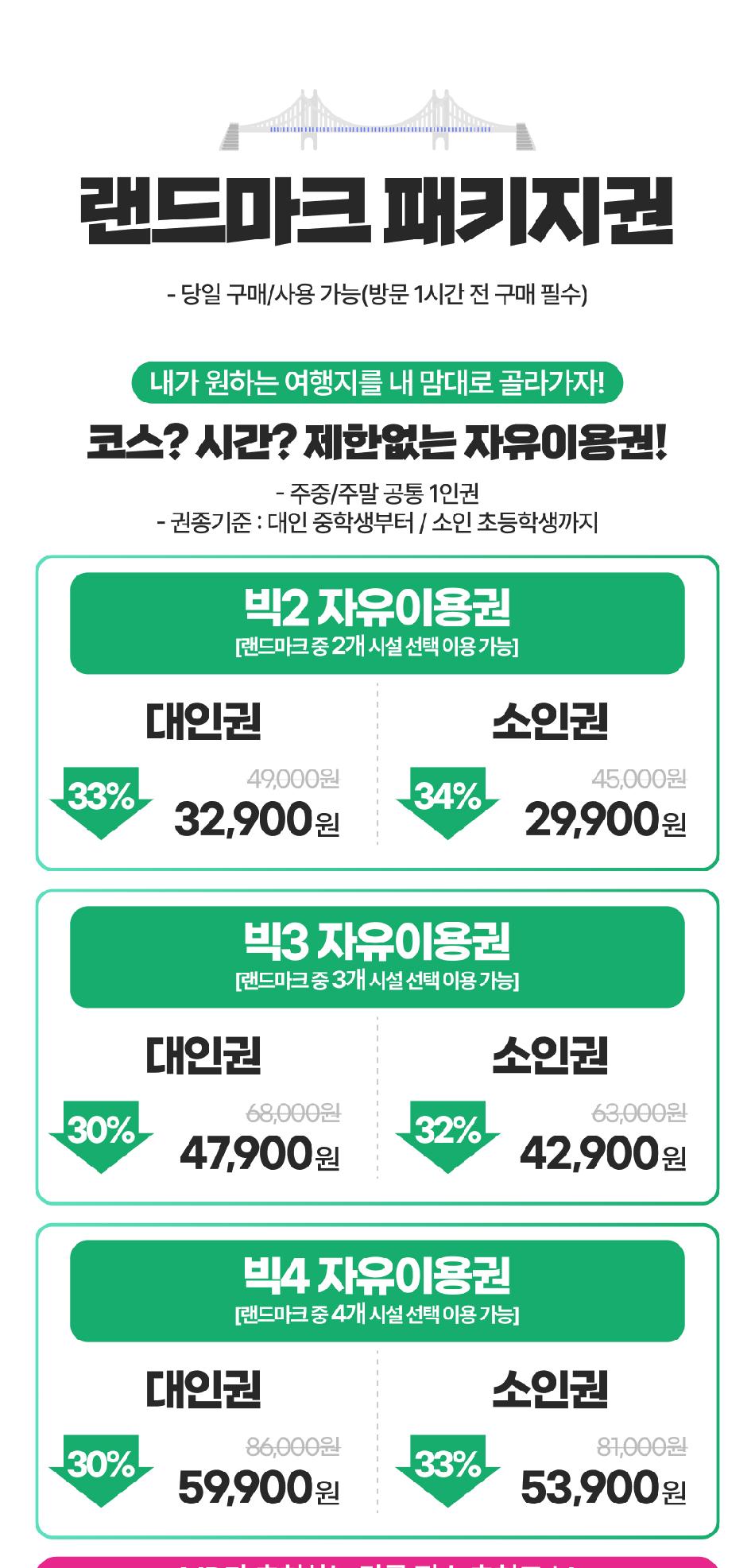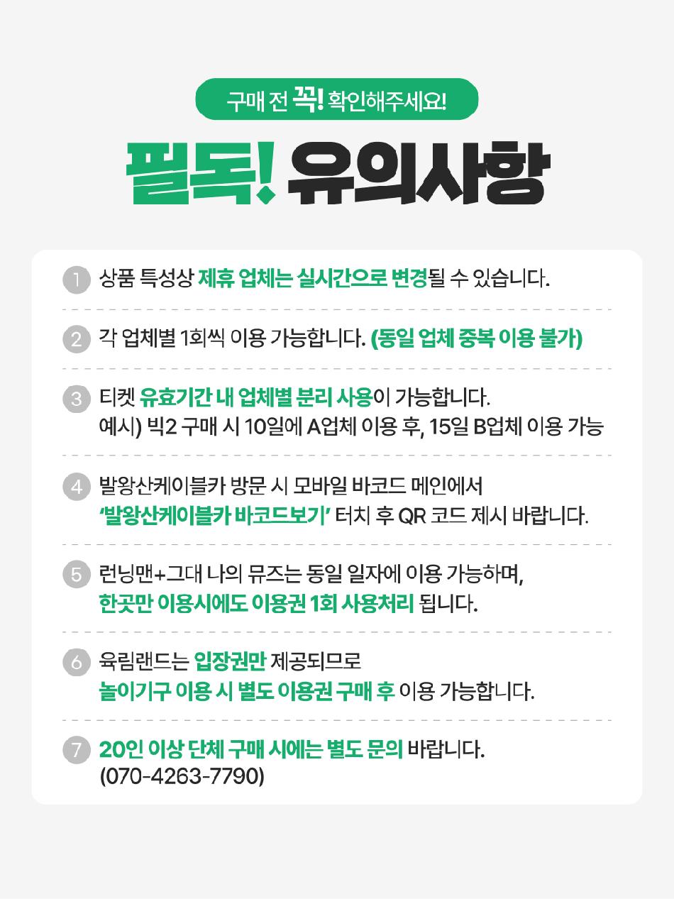 * 상품 특성상 제휴 업체는 실시간으로 변경될 수 있습니다. * 동일 업체 중복 이용 불가합니다. * 티켓 유효기간 내 업체별 분리 사용 가능합니다. * 티켓 부분 환불/부분 사용은 불가하며 일부 티켓 환불 필요 시 반드시 사용 전 티켓 전체 환불 후 재구매 바랍니다. * 단체 구매 시 별도 문의 바랍니다.