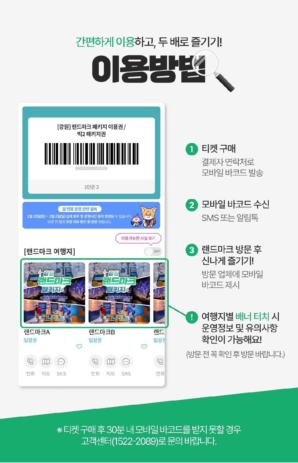 * 1. 상품구매 (당일구매/당일사용 가능 *원활한 알림톡 수신 위해 연락처 확인 필수!) * 2. 모바일 바코드URL 수신 * 3. 방문 업체에 모바일 바코드 제시 * ※ 제휴 시설, 운영정보 등이 실시간으로 변경될 수 있으므로, 바코드 내 여행지별 정보 확인 후 이용 바랍니다.
