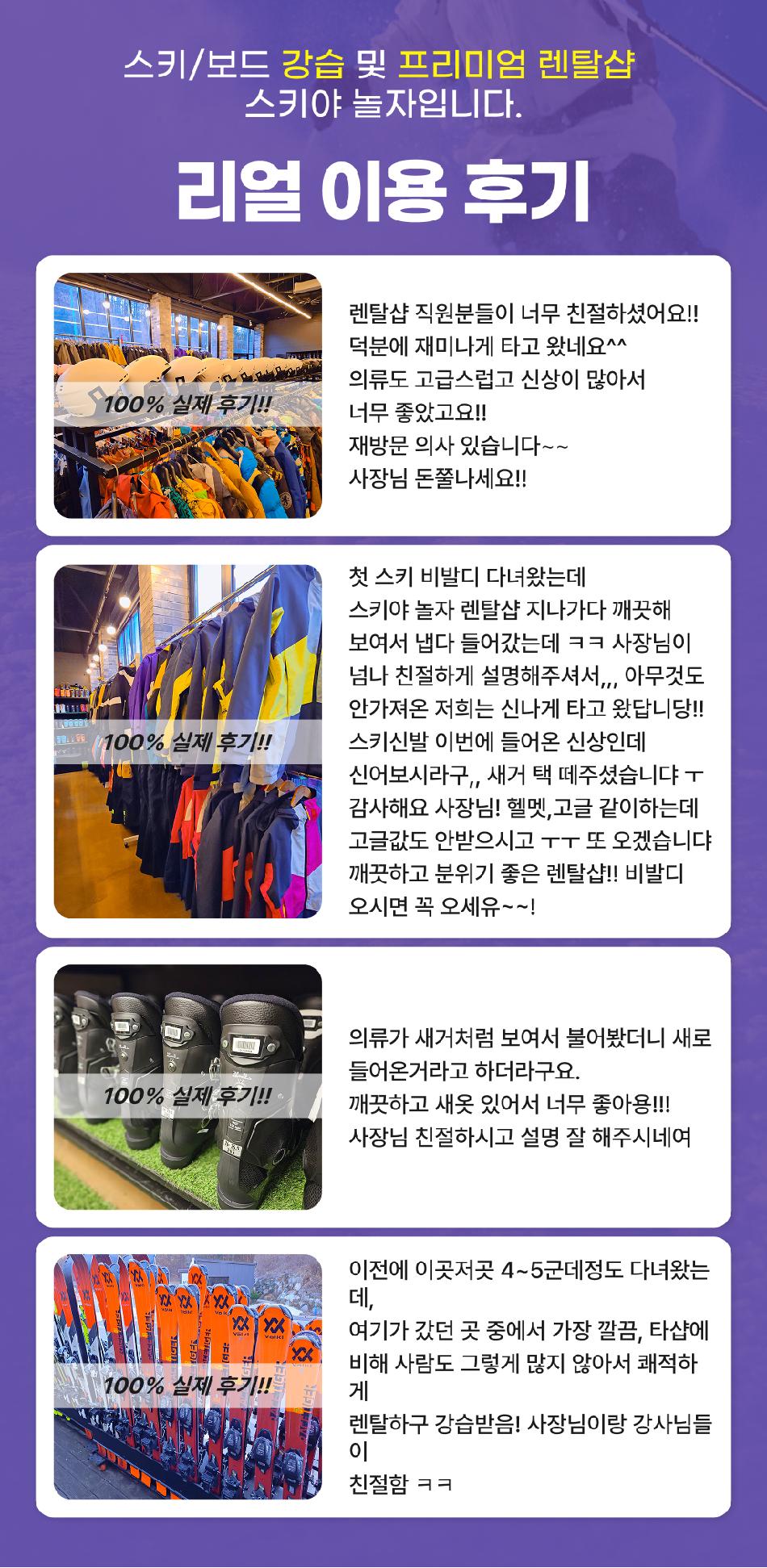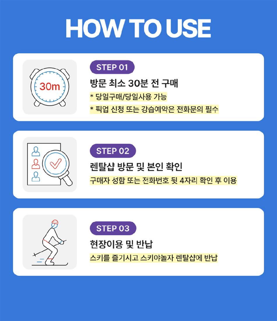* 본 상품은 25/26시즌 스키장 개장일부터 폐장일까지 사용 가능합니다. * 공휴일은 주말 요금 기준입니다. * 1. 방문 최소 30분 전 구매필수 (당일구매/당일사용 가능) * 2. 렌탈샵 방문하며 성함/연락처 확인 후 렌탈 * 3. 이용 완료 후 스키야놀자 렌탈샵에 반납
