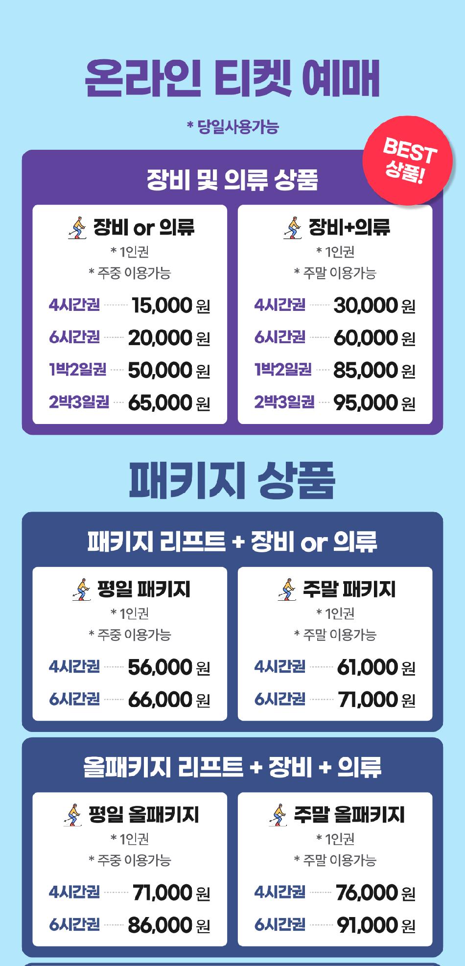 * 모든 옵션은 1인 기준가입니다. * 강습예약 및 픽업서비스 신청은 전화문의 부탁드립니다. - (공식인증 전문강사진 보유 및 자격증+보험+강습허가권 100% 소지) * 스키장갑, 바라클라바, 스키양말은 렌탈이 불가하며 매장에서 좋은 품질의 제품을 합리적인 가격으로 판매하고 있습니다. * 리프트권만 구매는 불가하며 렌탈고객에 한하여 매장에서 추가 구매 가능합니다. * 렌탈세부사항 안내 - 스키장비(스키부츠, 플레이트, 스키폴) - 보드장비(보드부츠, 데크, 바인딩) - 의류(상의+하의) - 보호장비(각 5,000원) - 기본보호대(무릎+엉덩이보호대), 손목보호대, 헬멧, 고글 - 프리미엄라인(숏스키, 프리미엄의류, 프리미엄장비, 바이저헬멧) 1일 기준 1만 5천원 현장에서 추가됩니다. * 장비+의류+헬멧+고글+리프트권PKG 최저가로 현장에서 구입 가능 *현장 문의 - 헬멧or고글or보호대 1일 렌탈은 현장에서 5,000원 결제 후 이용 가능합니다.