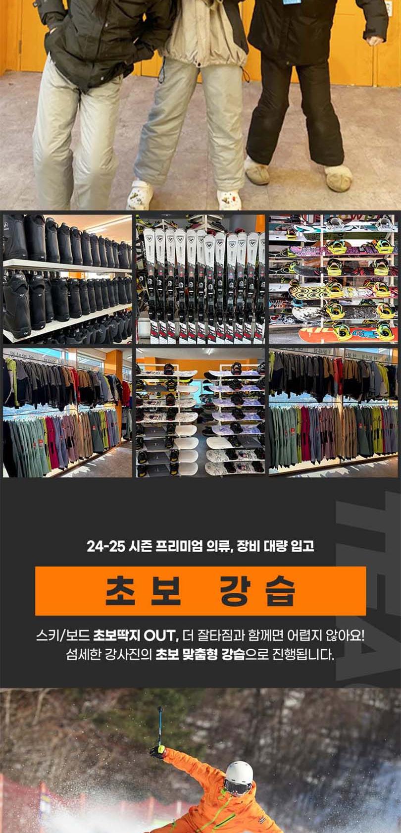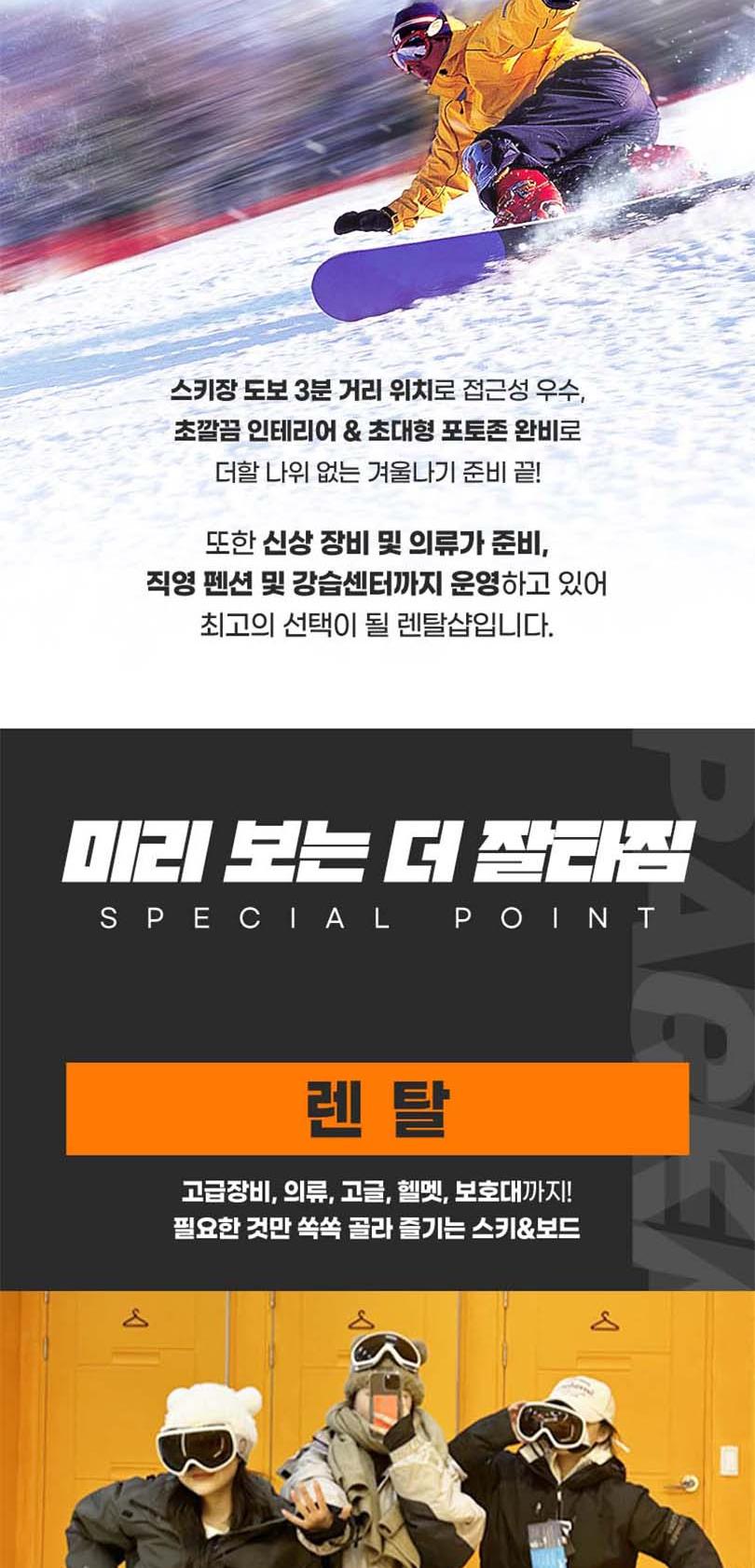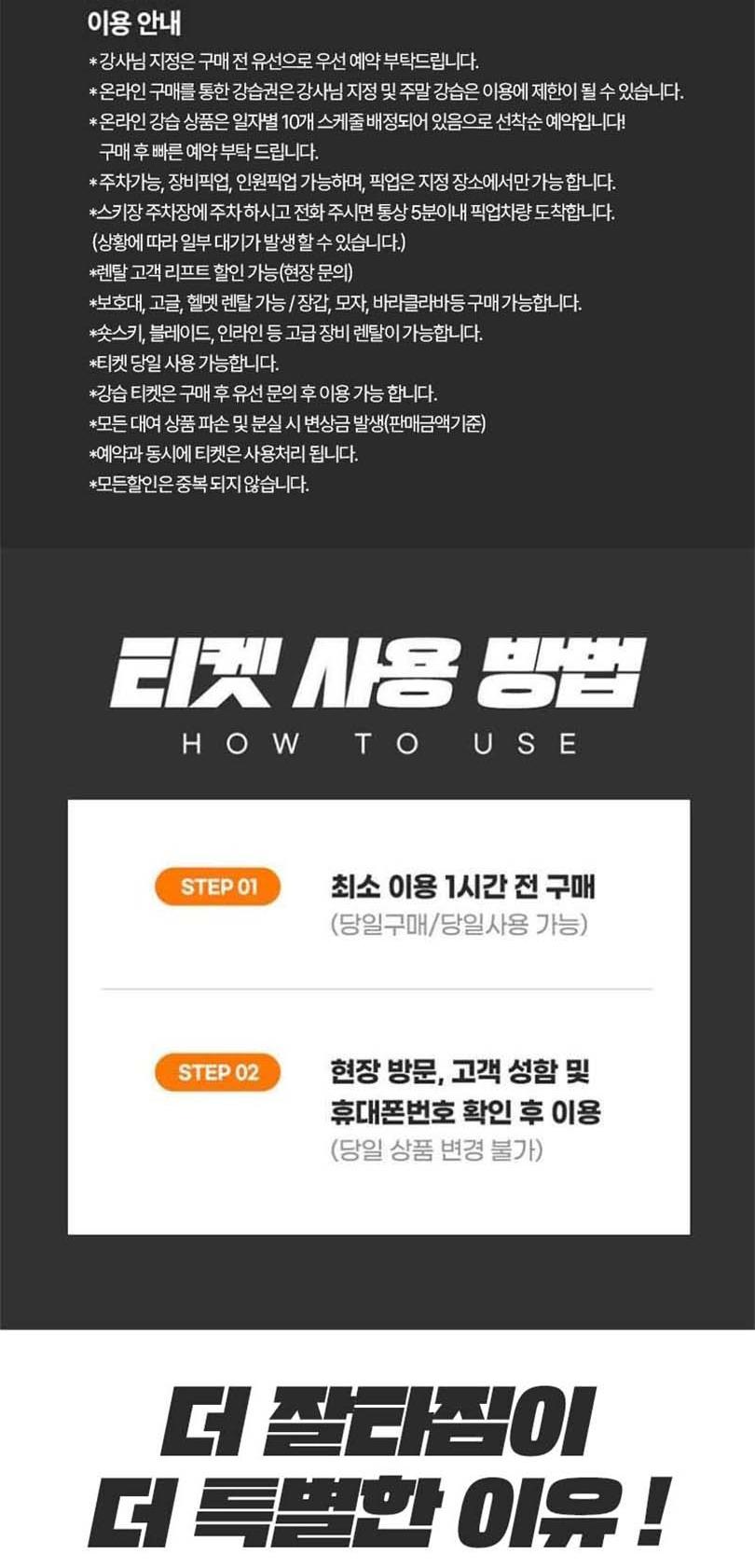 * 주차가능, 장비픽업, 인원픽업 가능 합니다. * 스키장 주차장에 주차 하시고 전화주시면 통상 5분이내 픽업차량 도착 합니다. (상황에 따라 일부 대기가 발생할 수 있음) * 렌탈 고객 리프트 할인 가능 (이용일 1일전 오후 19시까지 현장문의 필수) * 보호대, 고글 , 헬멧 렌탈가능/ 장갑, 모자 구매 가능합니다. * 렌탈샵 내에서 스키&보드에 필요한 모든 용품 구매가능합니다. * 인라인, 숏스키, 블레이드등 고급장비 렌탈 가능 합니다. * 당일 사용가능 합니다. * 모든 대여 상품 파손 및 분실 시 변상금 발생됩니다.(판매금액기준) * 예약과 동시에 사용처리됩니다 * 모든 할인은 중복되지 않습니다. * 온라인 구매를 통한 강습권은 강사님 지정 및 주말 강습은 이용에 제한이 될 수 있습니다. * 온라인 강습 상품은 일자별 10개 스케줄 배정되어 있음으로 선착순 예약입니다! * 강습권 구매 후 빠른 예약 부탁 드립니다.