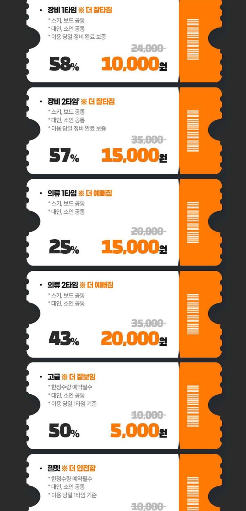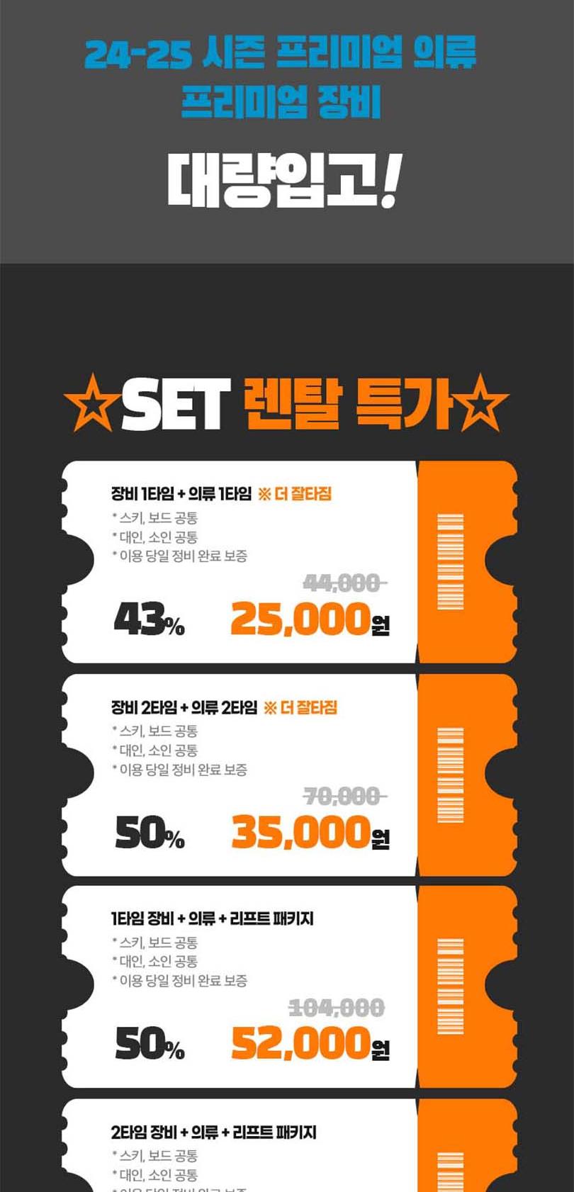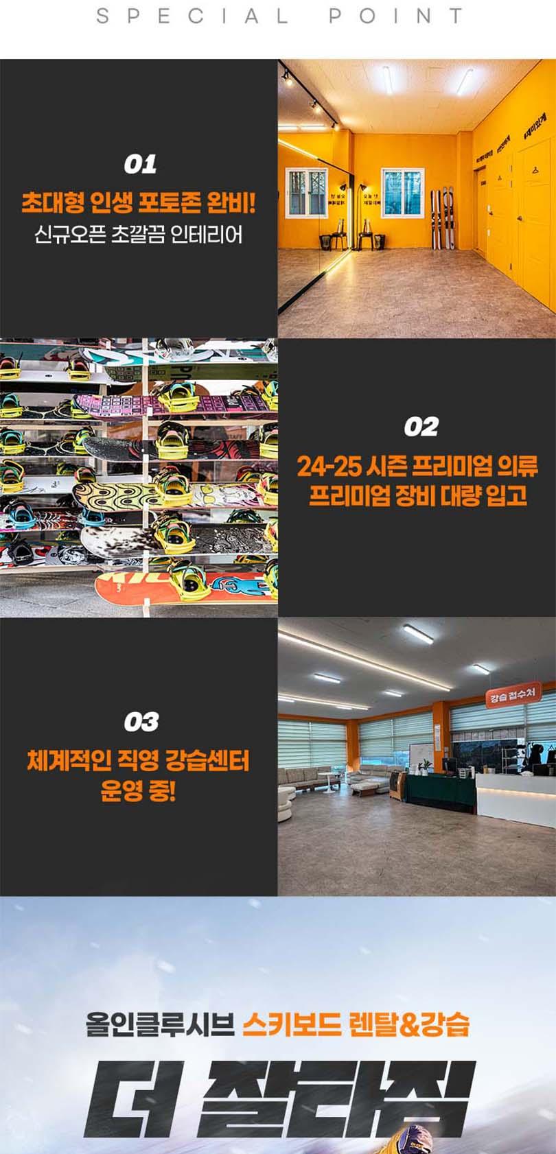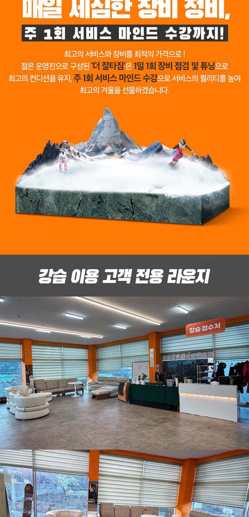 * 주차가능, 장비픽업, 인원픽업 가능 합니다. * 스키장 주차장에 주차 하시고 전화주시면 통상 5분이내 픽업차량 도착 합니다. (상황에 따라 일부 대기가 발생할 수 있음) * 렌탈 고객 리프트 할인 가능 (이용일 1일전 오후 19시까지 현장문의 필수) * 보호대, 고글 , 헬멧 렌탈가능/ 장갑, 모자 구매 가능합니다. * 렌탈샵 내에서 스키&보드에 필요한 모든 용품 구매가능합니다. * 인라인, 숏스키, 블레이드등 고급장비 렌탈 가능 합니다. * 당일 사용가능 합니다. * 모든 대여 상품 파손 및 분실 시 변상금 발생됩니다.(판매금액기준) * 예약과 동시에 사용처리됩니다 * 모든 할인은 중복되지 않습니다. * 온라인 구매를 통한 강습권은 강사님 지정 및 주말 강습은 이용에 제한이 될 수 있습니다. * 온라인 강습 상품은 일자별 10개 스케줄 배정되어 있음으로 선착순 예약입니다! * 강습권 구매 후 빠른 예약 부탁 드립니다.