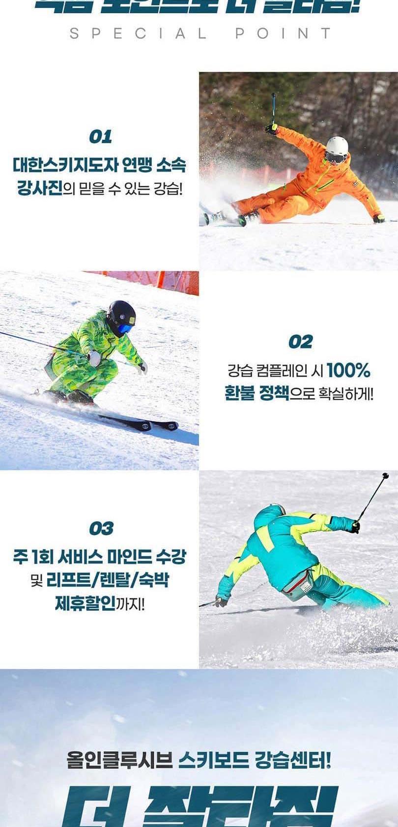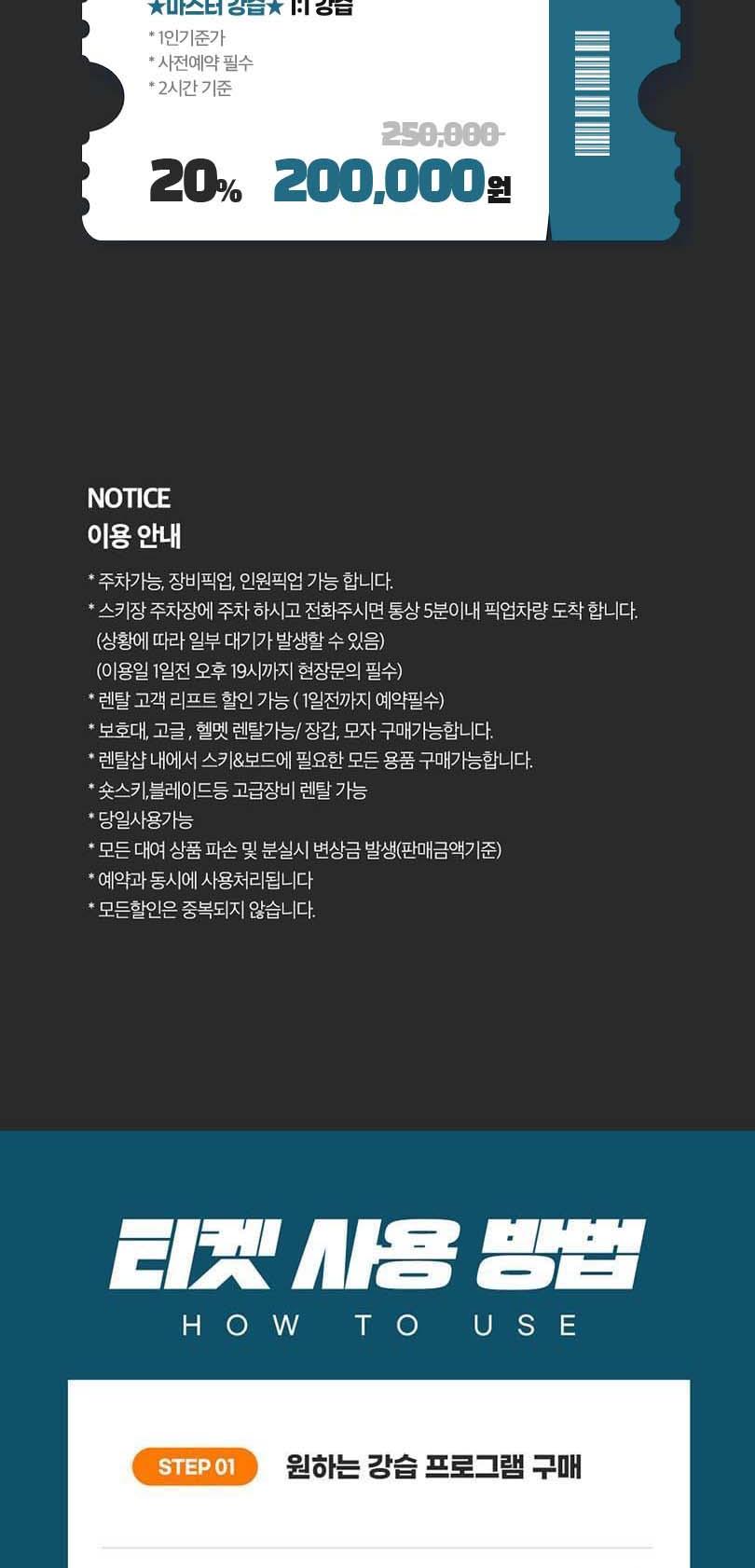 * 주차가능, 장비픽업, 인원픽업 가능 합니다. * 스키장 주차장에 주차 하시고 전화주시면 통상 5분이내 픽업차량 도착 합니다. (상황에 따라 일부 대기가 발생할 수 있음) * 렌탈 고객 리프트 할인 가능 (이용일 1일전 오후 19시까지 현장문의 필수) * 보호대, 고글 , 헬멧 렌탈가능/ 장갑, 모자 구매 가능합니다. * 렌탈샵 내에서 스키&보드에 필요한 모든 용품 구매가능합니다. * 인라인, 숏스키, 블레이드등 고급장비 렌탈 가능 합니다. * 당일 사용가능 합니다. * 모든 대여 상품 파손 및 분실 시 변상금 발생됩니다.(판매금액기준) * 예약과 동시에 사용처리됩니다 * 모든 할인은 중복되지 않습니다. * 온라인 구매를 통한 강습권은 강사님 지정 및 주말 강습은 이용에 제한이 될 수 있습니다. * 온라인 강습 상품은 일자별 10개 스케줄 배정되어 있음으로 선착순 예약입니다! * 강습권 구매 후 빠른 예약 부탁 드립니다.