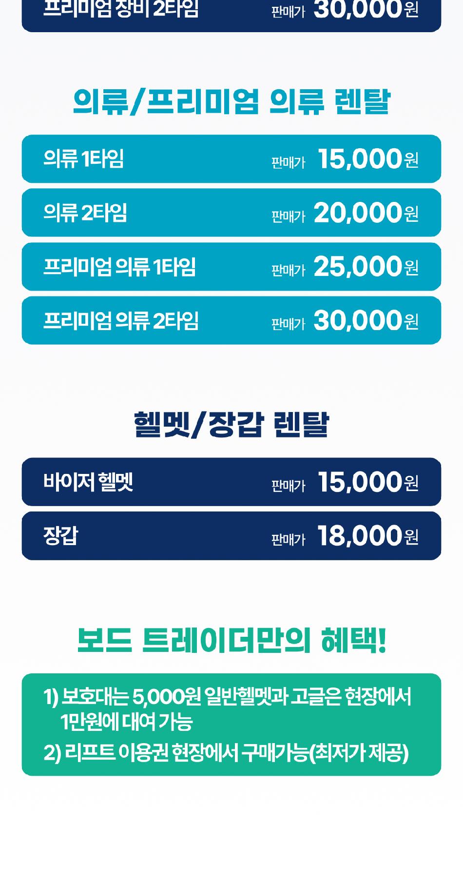 * 5. 보호대는 5000원, 일반헬맷과 고글은 1만원에 현장에서 대여 가능합니다