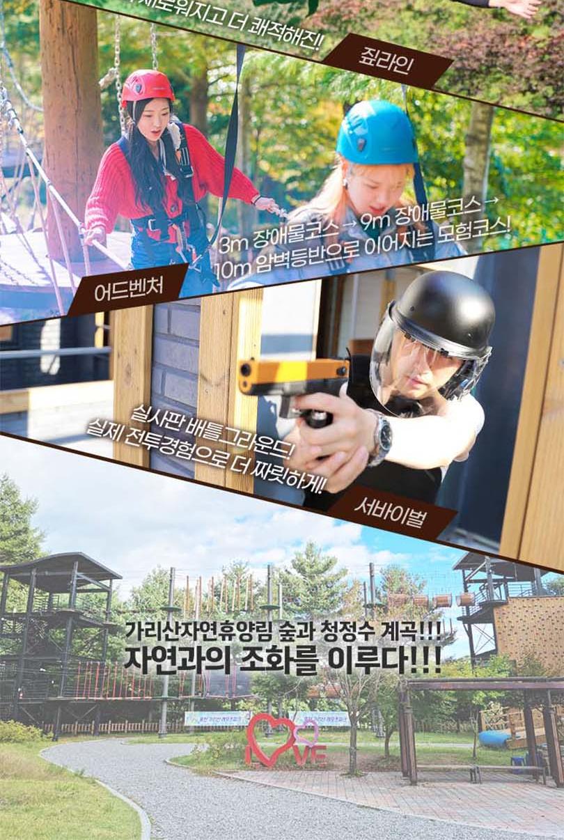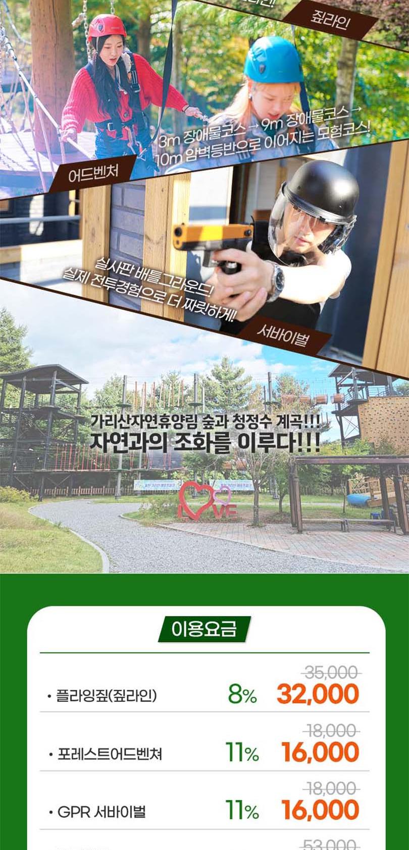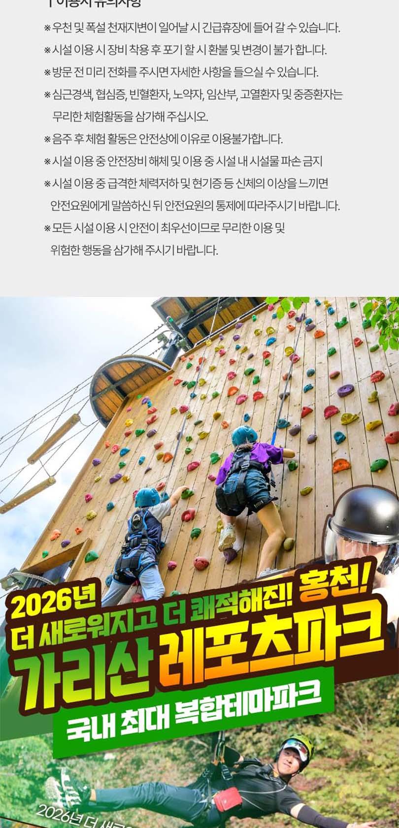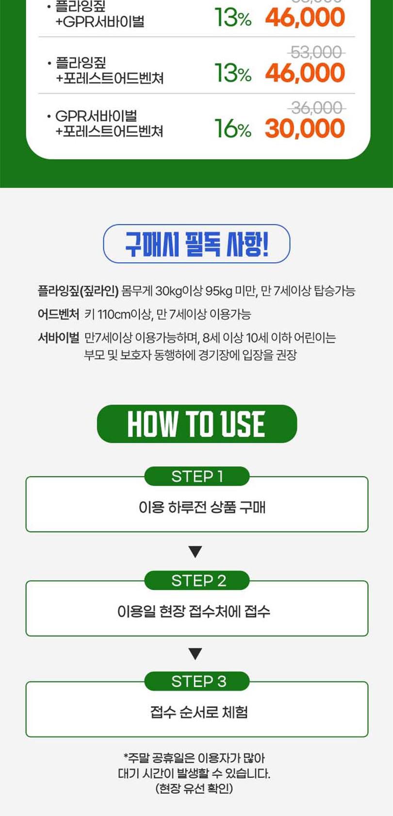 * 사전 구매후 현장 선착순 접수 이용가능 - 서바이벌, 포레스트어드벤처 : 초등학생 이상 이용가능 - 플라잉짚(짚라인): 몸무게 30kg이상 95kg 미만 탑승가능 * 근골계 질환(디스크, 골절, 일자목 등)이 있으시거나 3개월 이내 수술을 하신 분은 탑승하실 수 없습니다. * 심장 질환, 임신, 고소공포증, 비행 공포증이 있으신 분은 탑승하실 수 없습니다. * 탑승 전 음주 하신 분은 탑승하실 수 없습니다. * 탑승 복장은 편한복장이며(치마불가) 신발은 운동화를(슬리퍼,크록스,굽높은 힐 불가) 권장하며 긴 머리는 꼭 묶고 이용하시기 바랍니다. * 플라잉 짚은 타 짚라인 시설과 달리 안전 규정 상 2인 동시 탑승하실 수 없습니다. * 날씨관계로 인하여 영업시간이 변경 또는 조기마감될 수도 있습니다. * 기상상황에 따라 사전 예고없이 운영이 중단될 수 있습니다. * 주말 연휴 등은 조기 마감될 수 있으니 이용전 유선 문의 바랍니다.