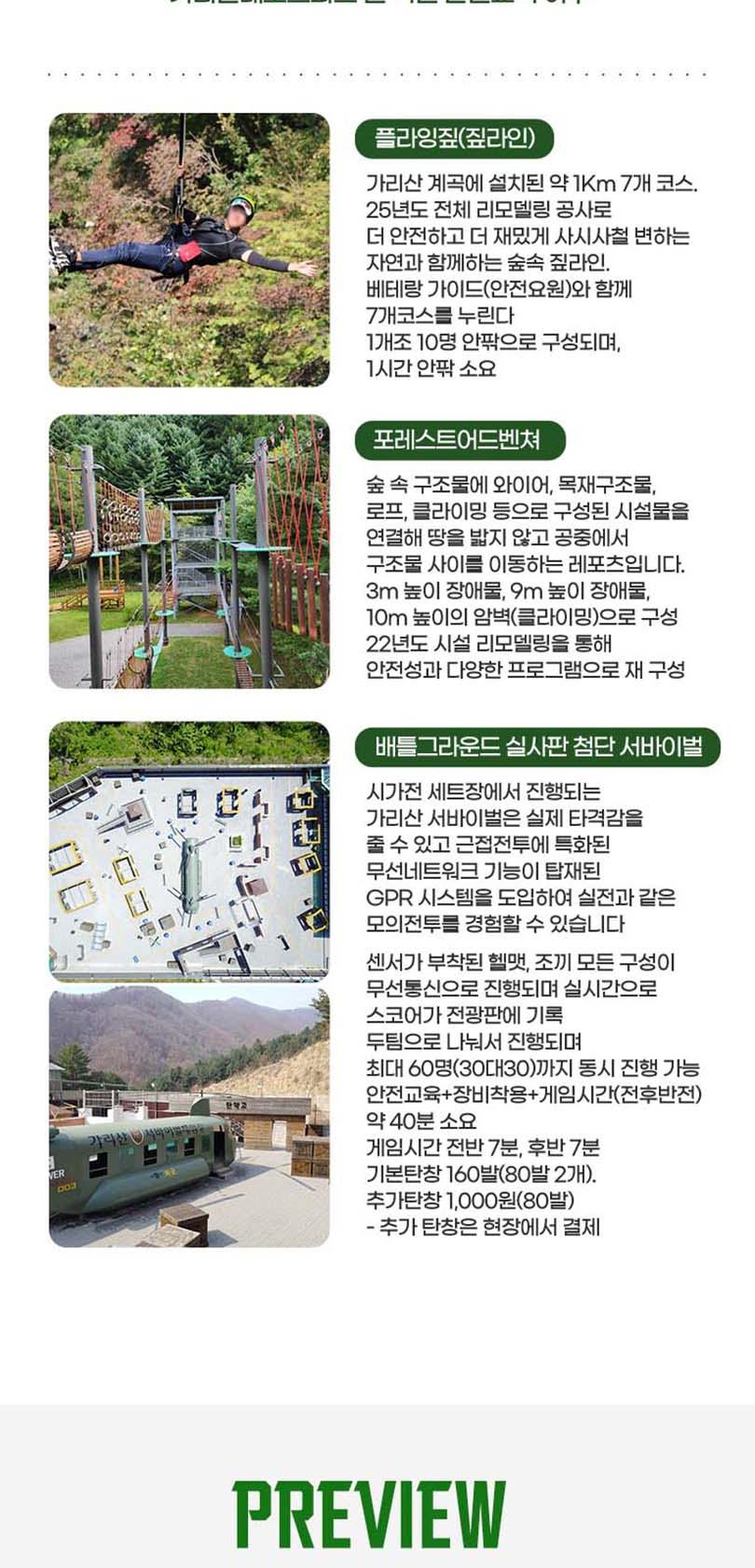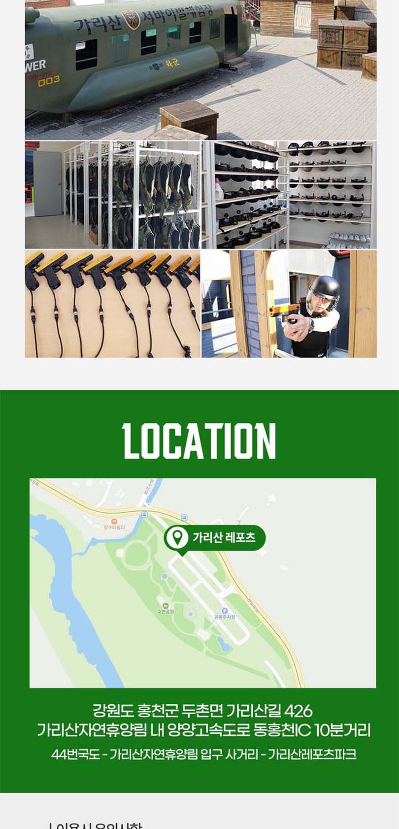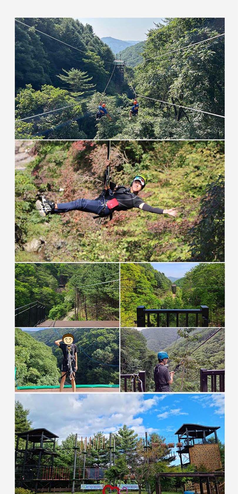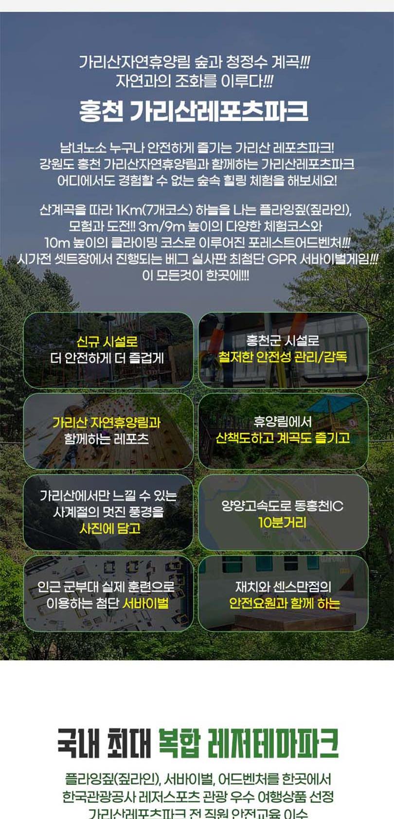 * 사전 구매후 현장 선착순 접수 이용가능 - 서바이벌, 포레스트어드벤처 : 초등학생 이상 이용가능 - 플라잉짚(짚라인): 몸무게 30kg이상 95kg 미만 탑승가능 * 근골계 질환(디스크, 골절, 일자목 등)이 있으시거나 3개월 이내 수술을 하신 분은 탑승하실 수 없습니다. * 심장 질환, 임신, 고소공포증, 비행 공포증이 있으신 분은 탑승하실 수 없습니다. * 탑승 전 음주 하신 분은 탑승하실 수 없습니다. * 탑승 복장은 편한복장이며(치마불가) 신발은 운동화를(슬리퍼,크록스,굽높은 힐 불가) 권장하며 긴 머리는 꼭 묶고 이용하시기 바랍니다. * 플라잉 짚은 타 짚라인 시설과 달리 안전 규정 상 2인 동시 탑승하실 수 없습니다. * 날씨관계로 인하여 영업시간이 변경 또는 조기마감될 수도 있습니다. * 기상상황에 따라 사전 예고없이 운영이 중단될 수 있습니다. * 주말 연휴 등은 조기 마감될 수 있으니 이용전 유선 문의 바랍니다.